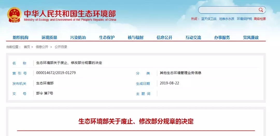 《生態環境部關于廢止、修改部分規章的決定》已于2019年7月11日由生態環境部部務會議審議通過,現予公布,自公布之日起施行。